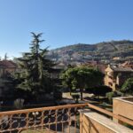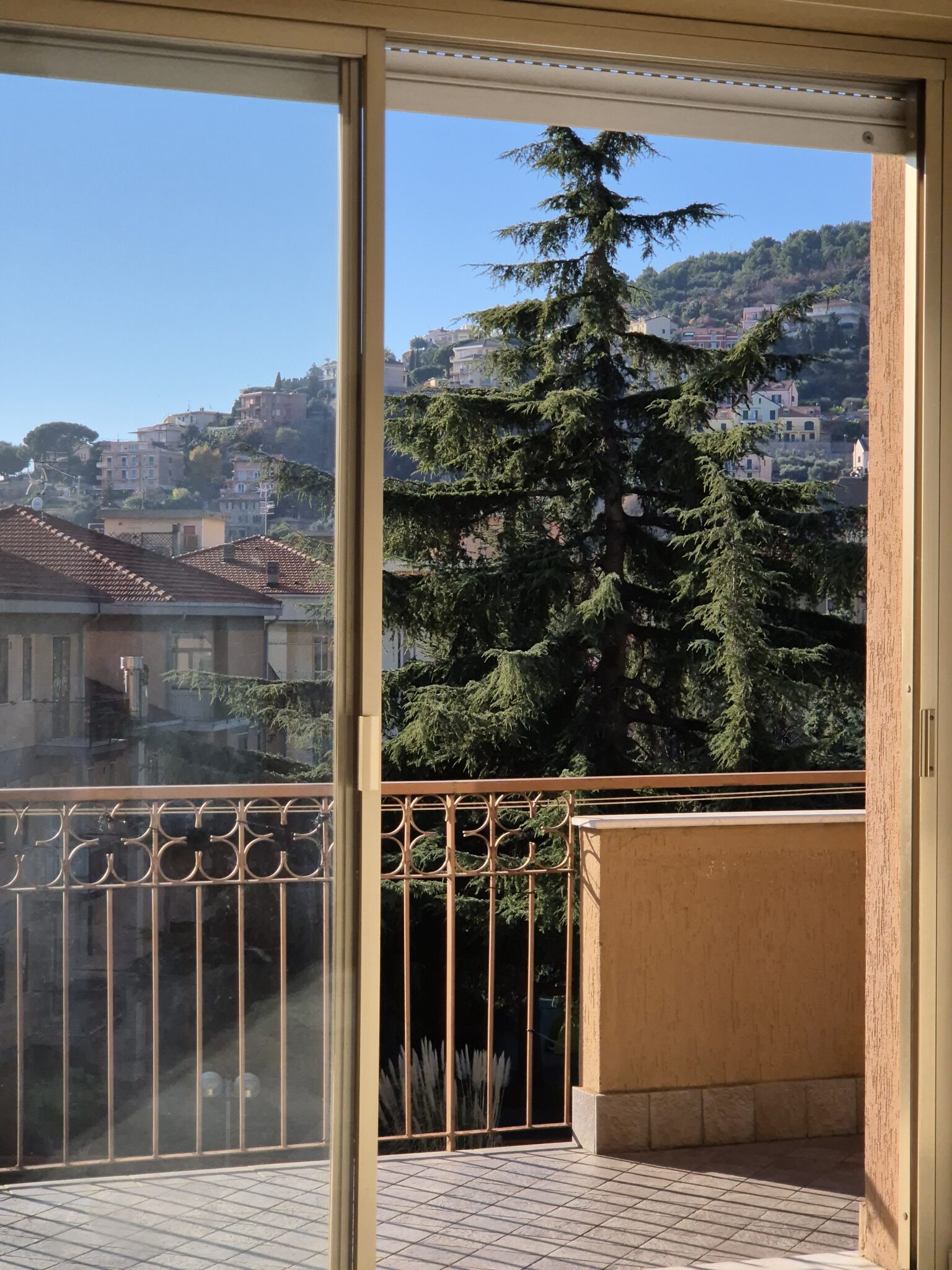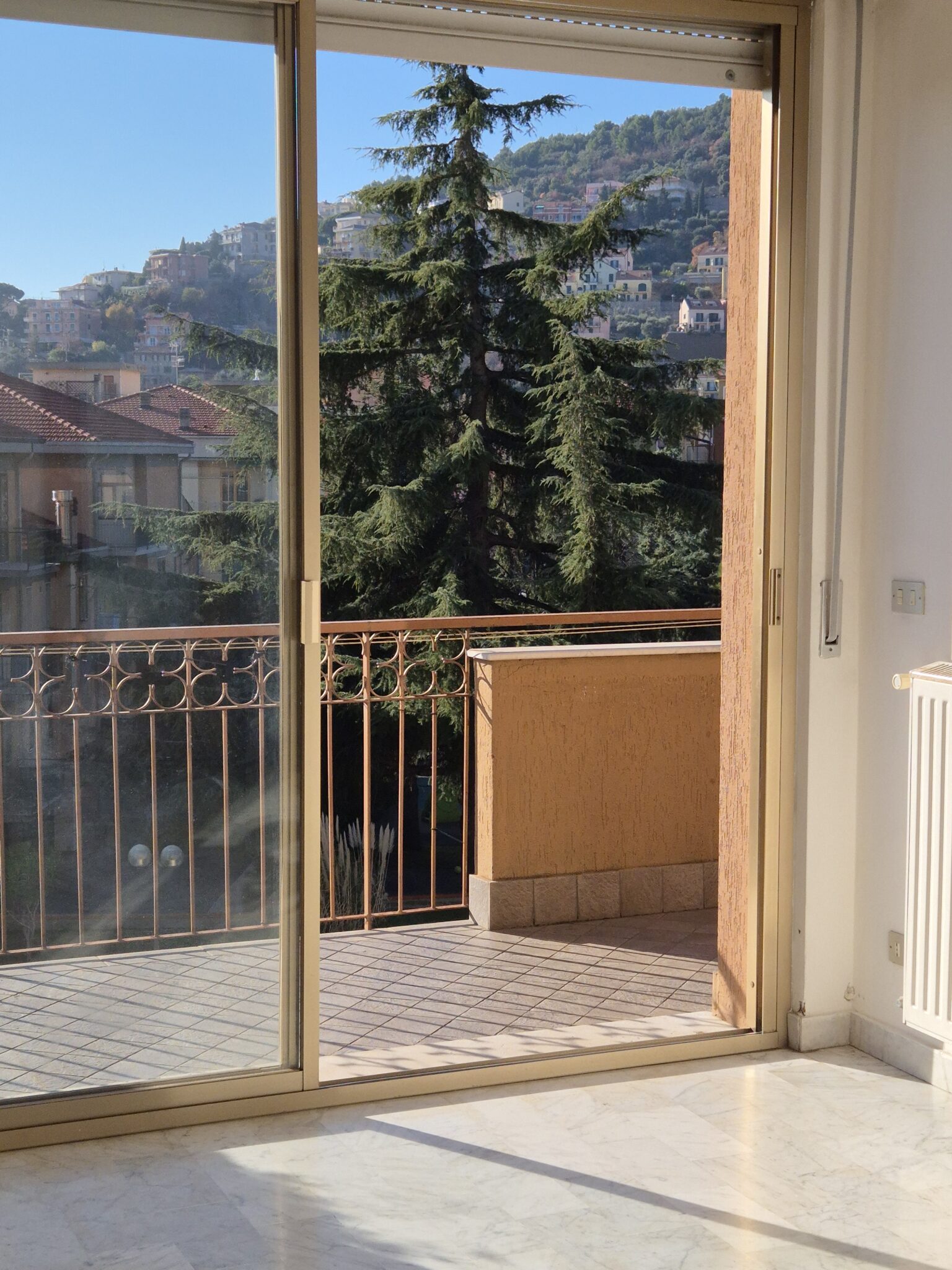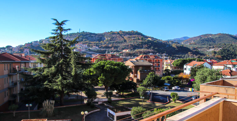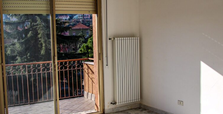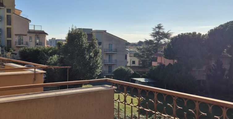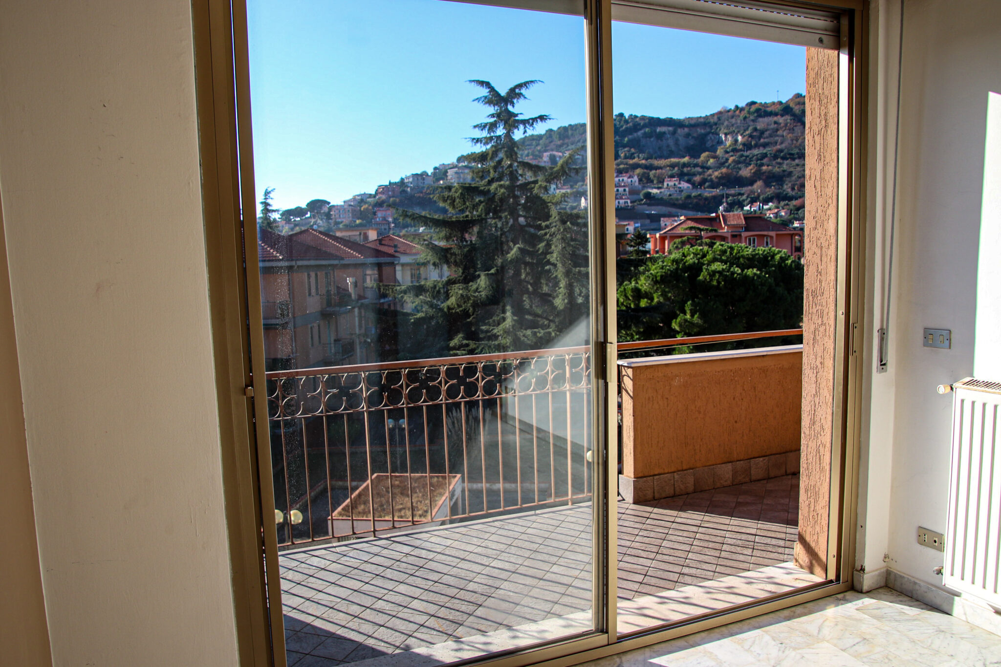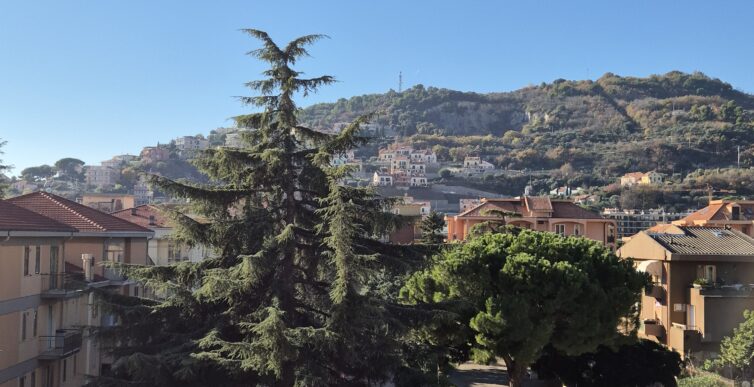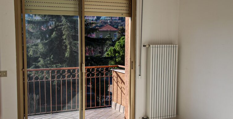Il soggiorno gode di un’eccellente esposizione e si apre su un’ampia vetrata scorrevole che inonda l’ambiente di luce naturale per gran parte della giornata. Da qui si accede al balcone vivibile, affacciato su un gradevole contesto verde e su un panorama collinare punteggiato da edifici residenziali, offrendo una piacevole continuità tra interno ed esterno.