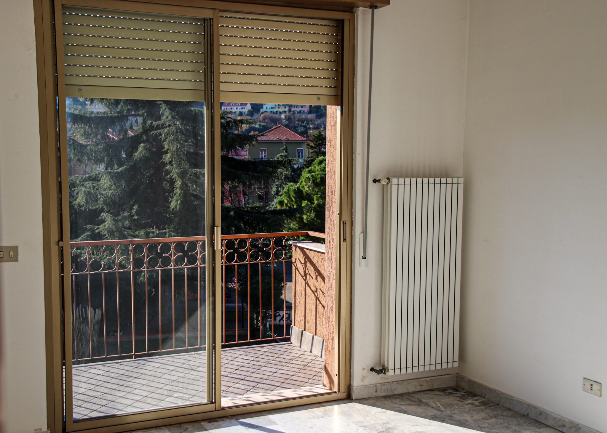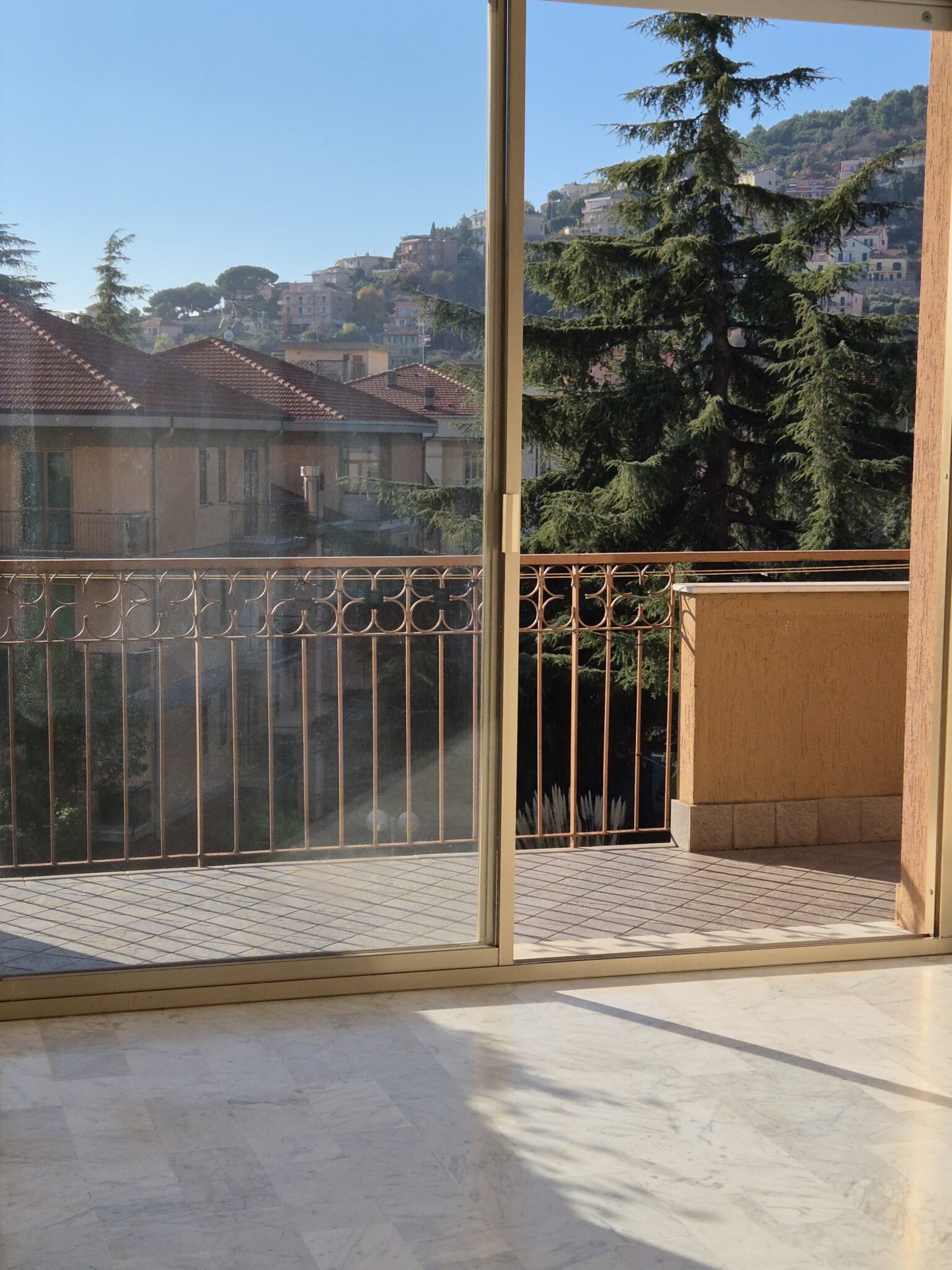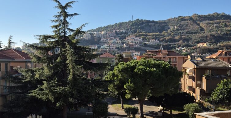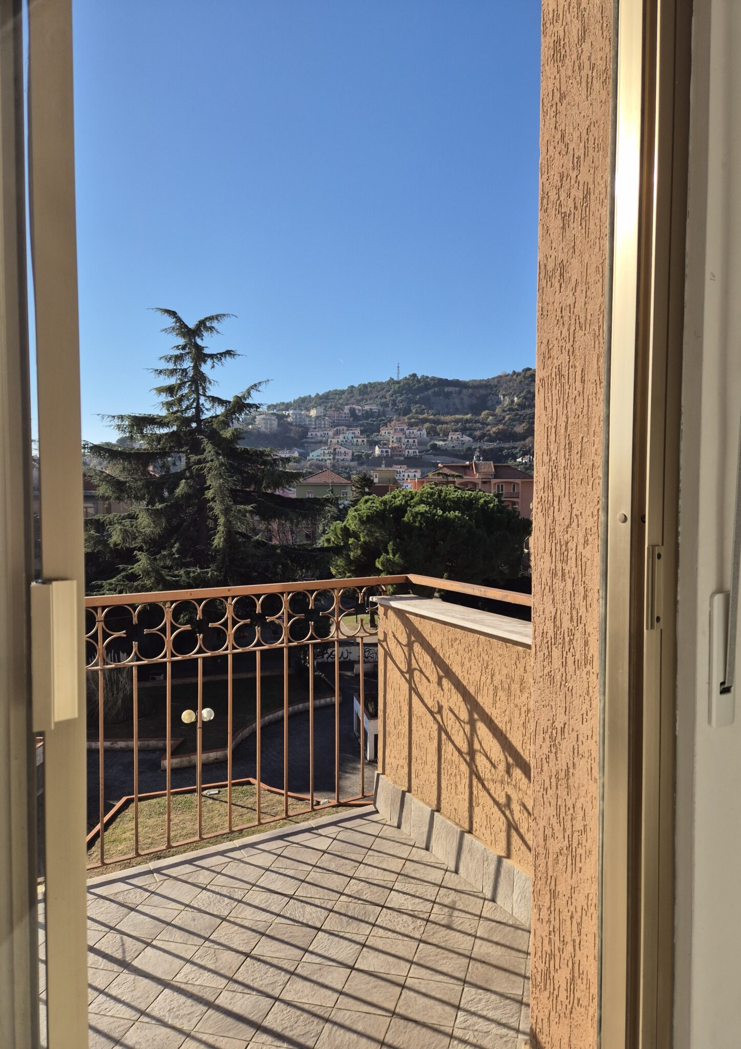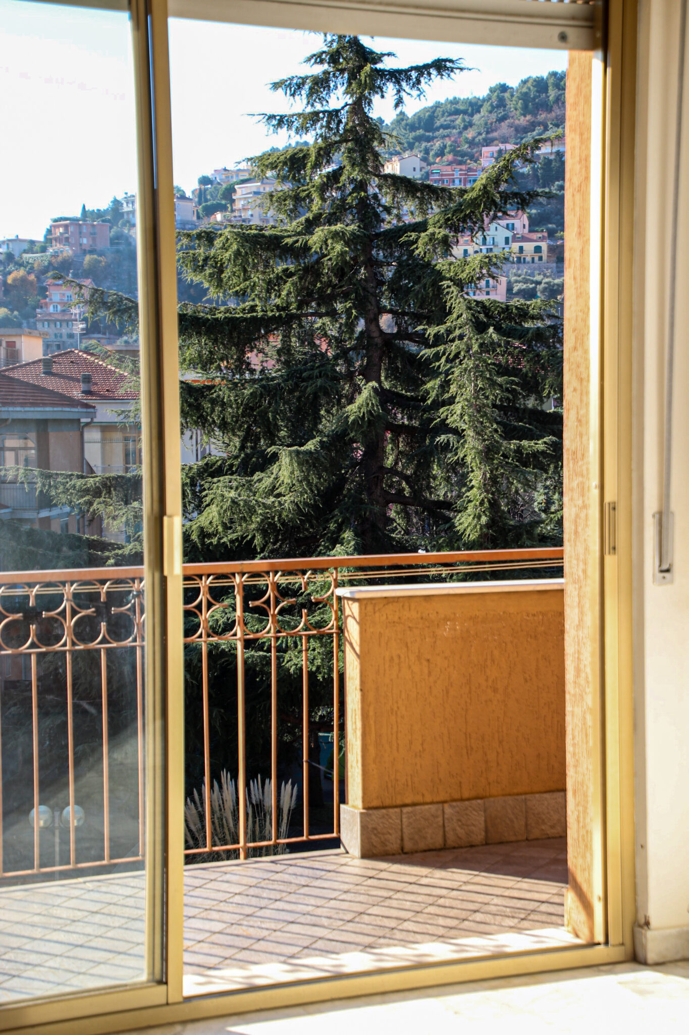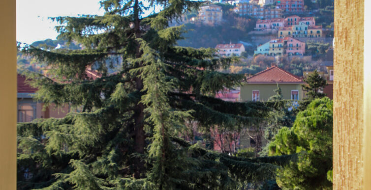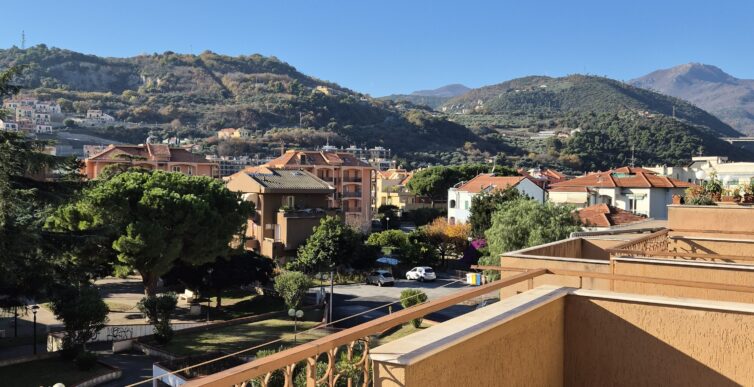 Il soggiorno gode di un’eccellente esposizione e si apre su un’ampia vetrata scorrevole che inonda l’ambiente di luce naturale per gran parte della giornata. Da qui si accede al balcone vivibile, affacciato su un gradevole contesto verde e su un panorama collinare punteggiato da edifici residenziali, offrendo una piacevole continuità tra interno ed esterno.