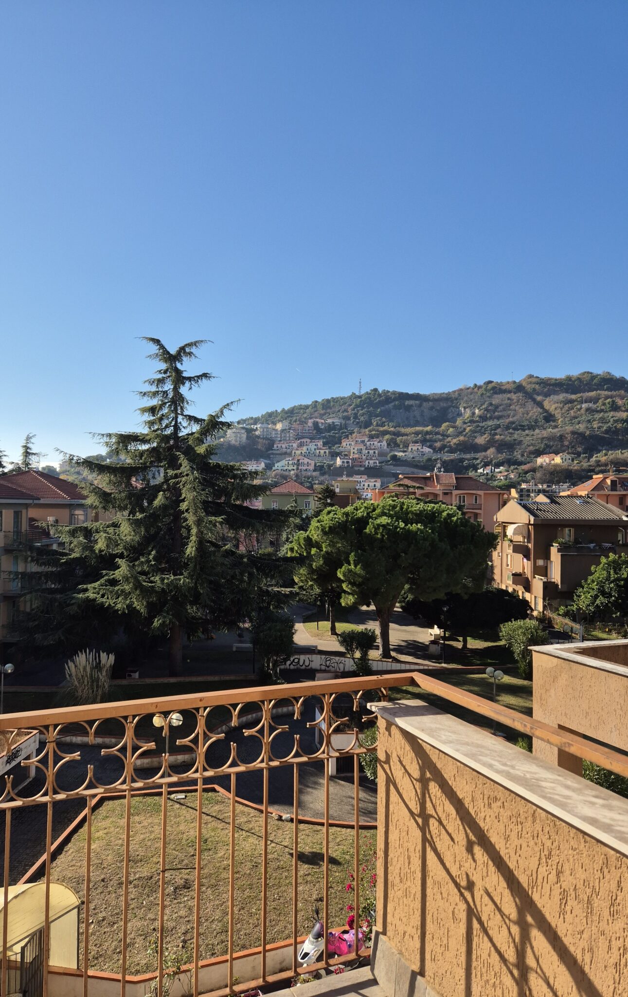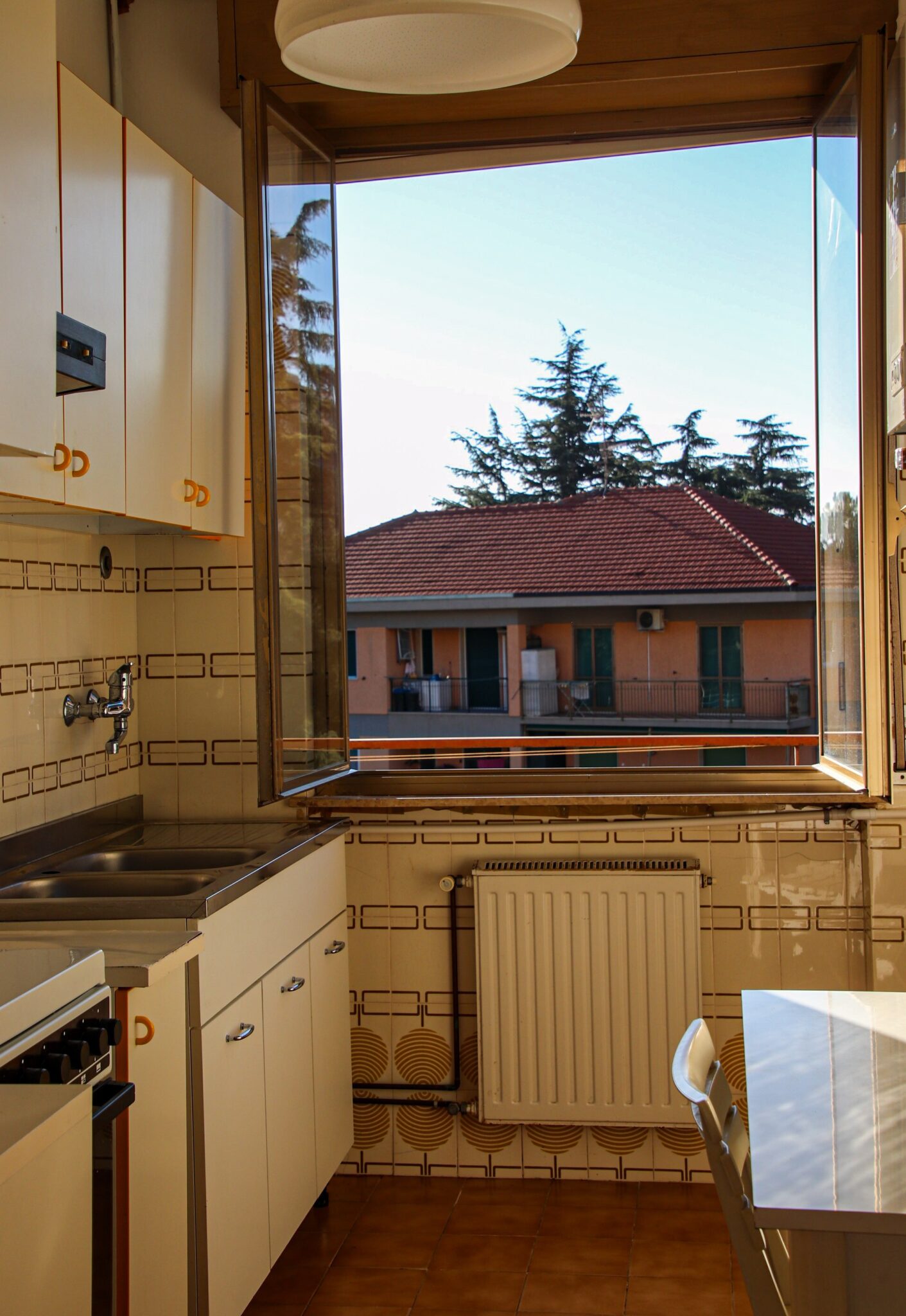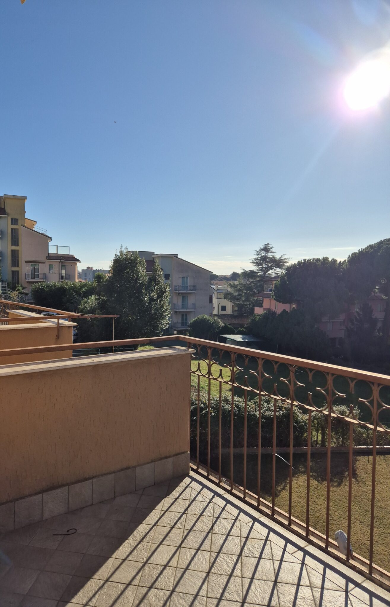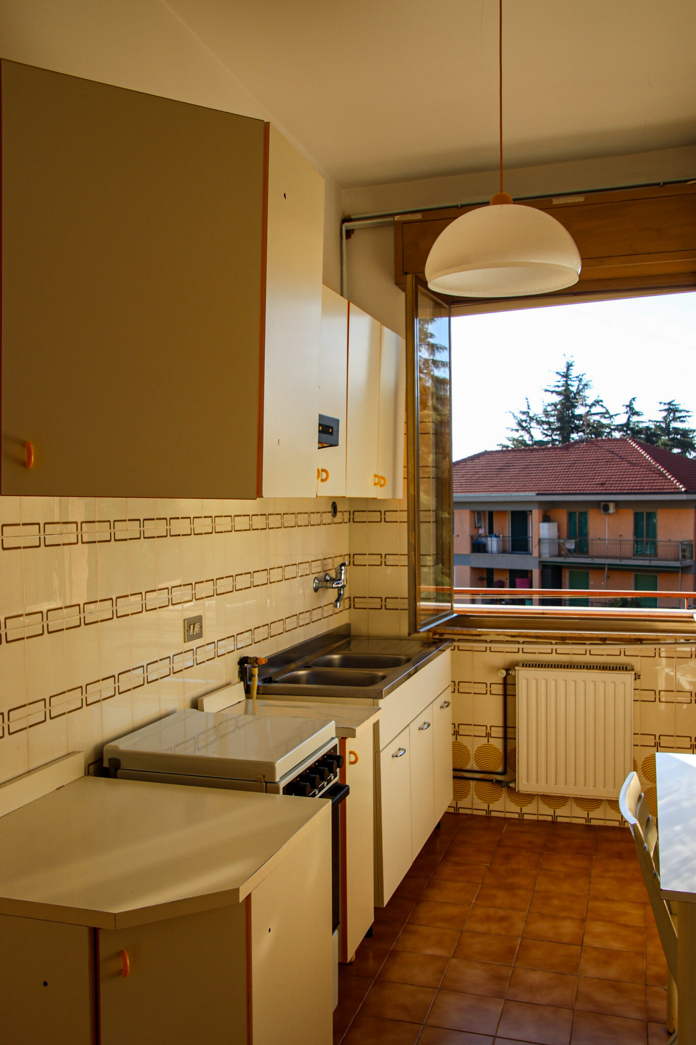 Il soggiorno gode di un’eccellente esposizione e si apre su un’ampia vetrata scorrevole che inonda l’ambiente di luce naturale per gran parte della giornata. Da qui si accede al balcone vivibile, affacciato su un gradevole contesto verde e su un panorama collinare punteggiato da edifici residenziali, offrendo una piacevole continuità tra interno ed esterno.
