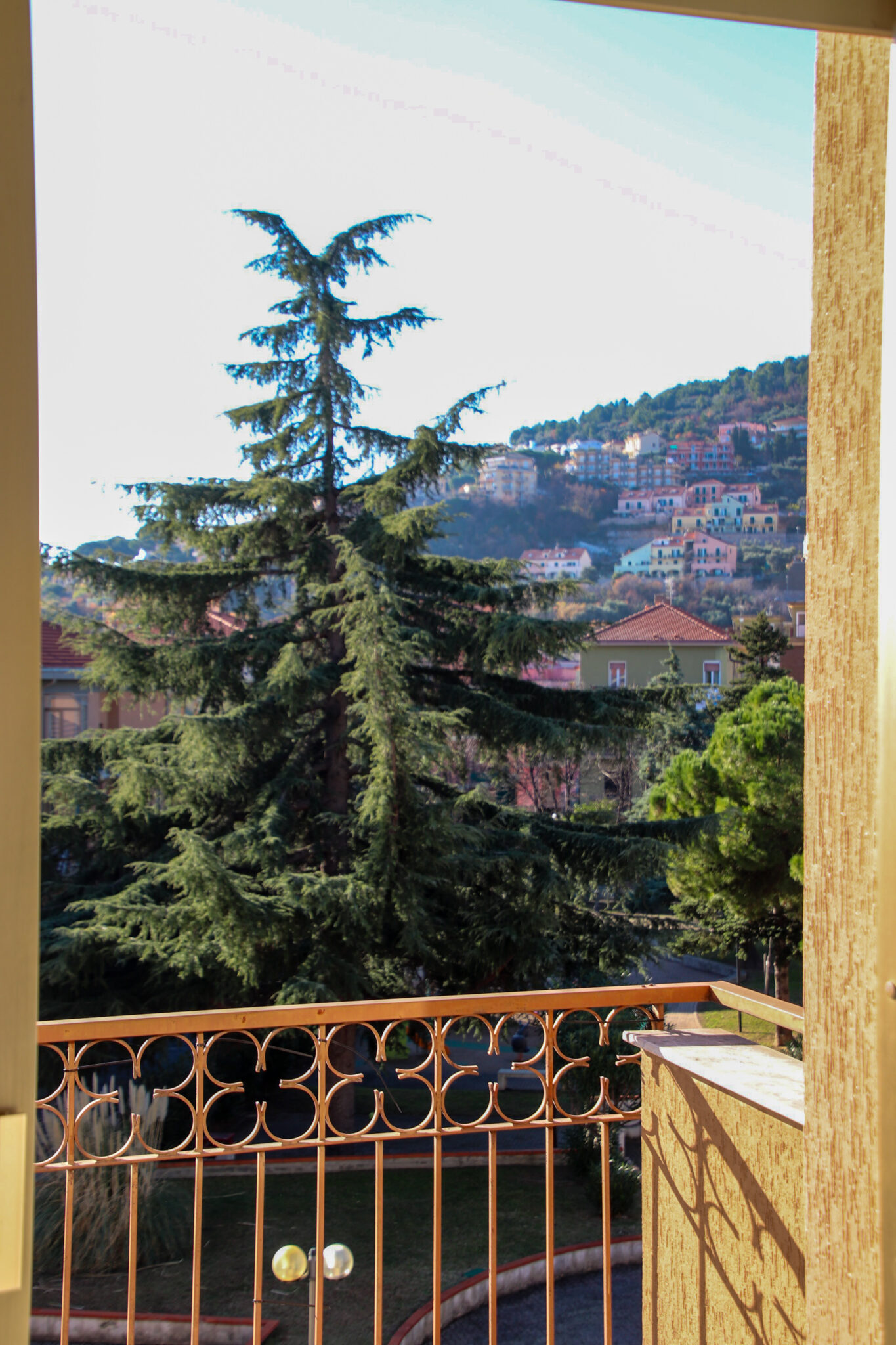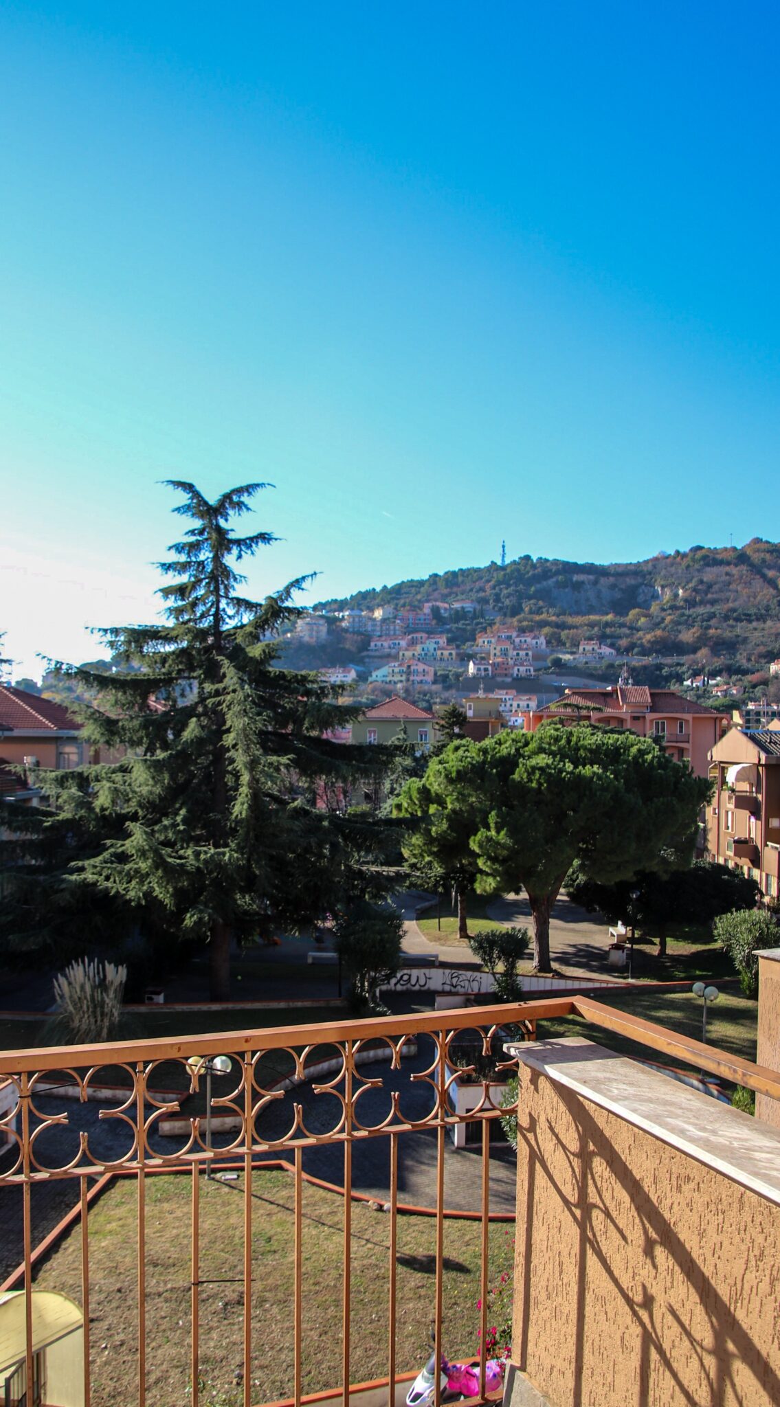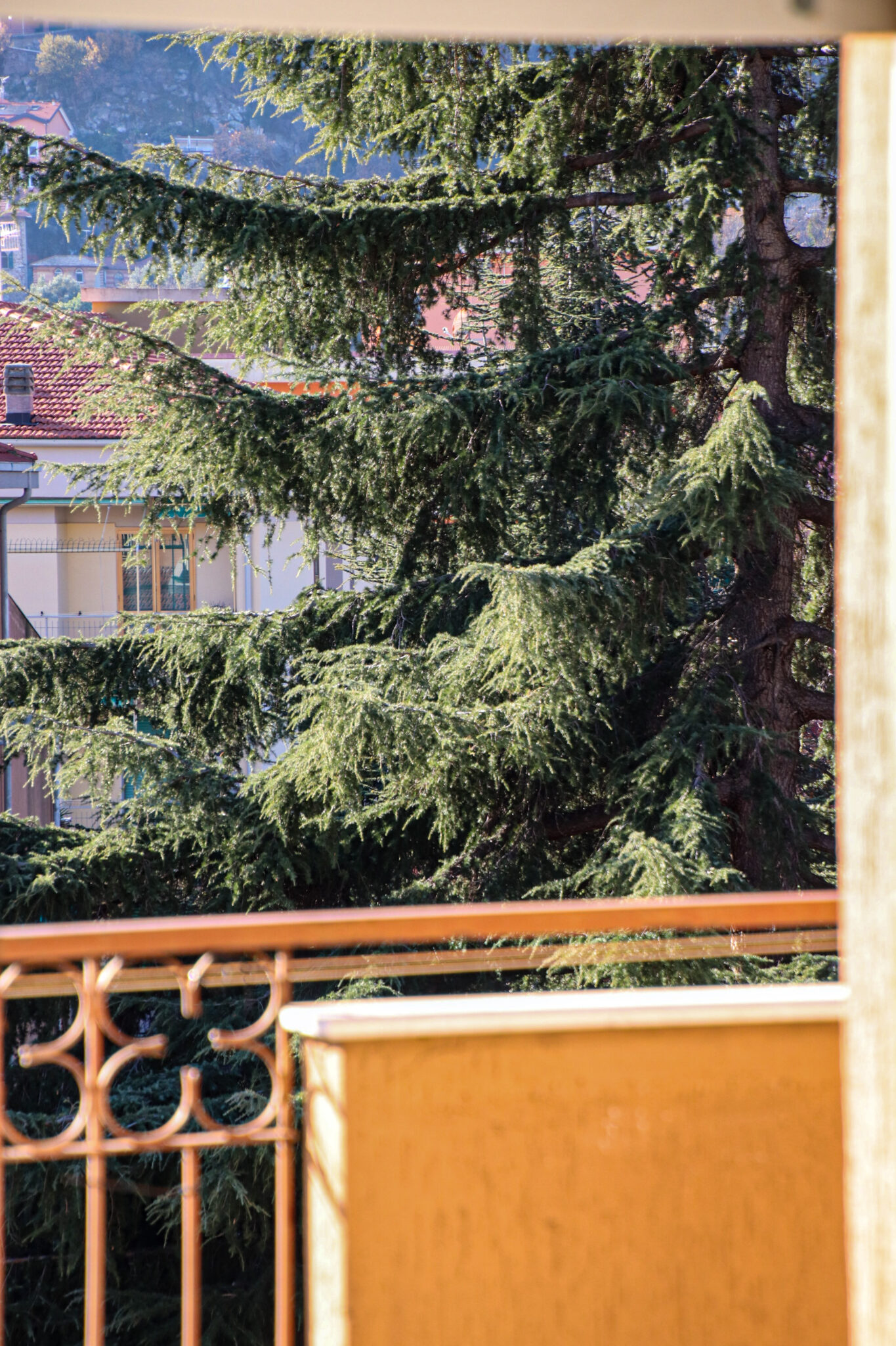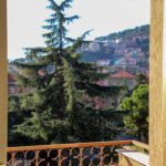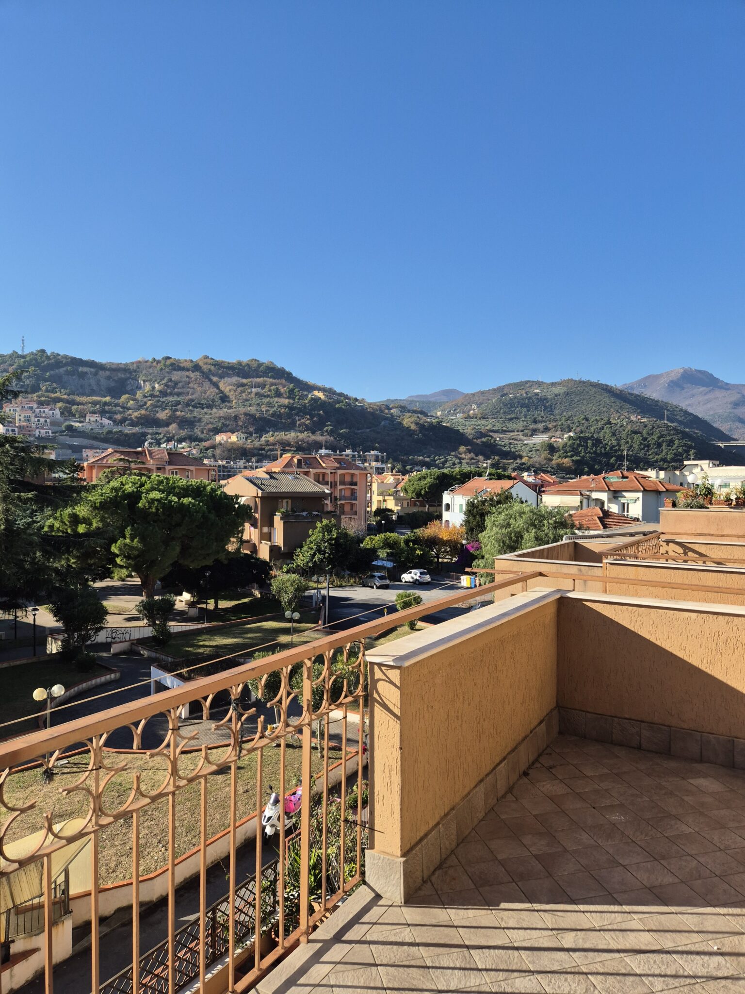 Il soggiorno gode di un’eccellente esposizione e si apre su un’ampia vetrata scorrevole che inonda l’ambiente di luce naturale per gran parte della giornata. Da qui si accede al balcone vivibile, affacciato su un gradevole contesto verde e su un panorama collinare punteggiato da edifici residenziali, offrendo una piacevole continuità tra interno ed esterno.